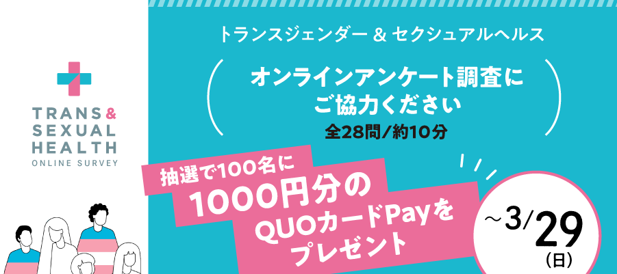 - 日本ではトランスジェンダーの性の健康に関するデータが不足しています。トランスジェンダー当事者のセクシャルヘルスの現状を知るためのアンケートを実施しています。どうかあなたの声を聞かせてください。
